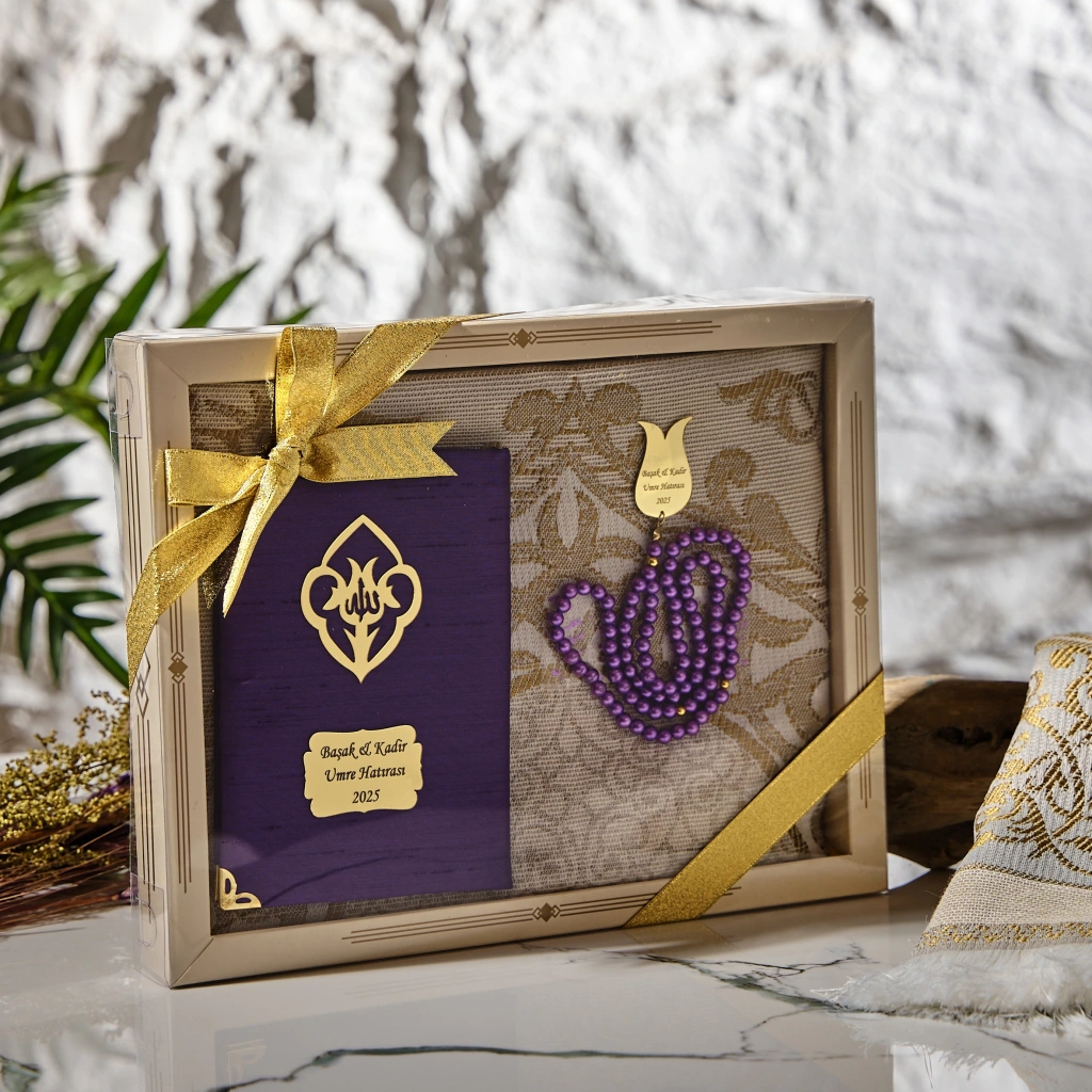 İsme Özel Silindir Kutu İçerisinde Mor Renkli Seccade ve Tesbih