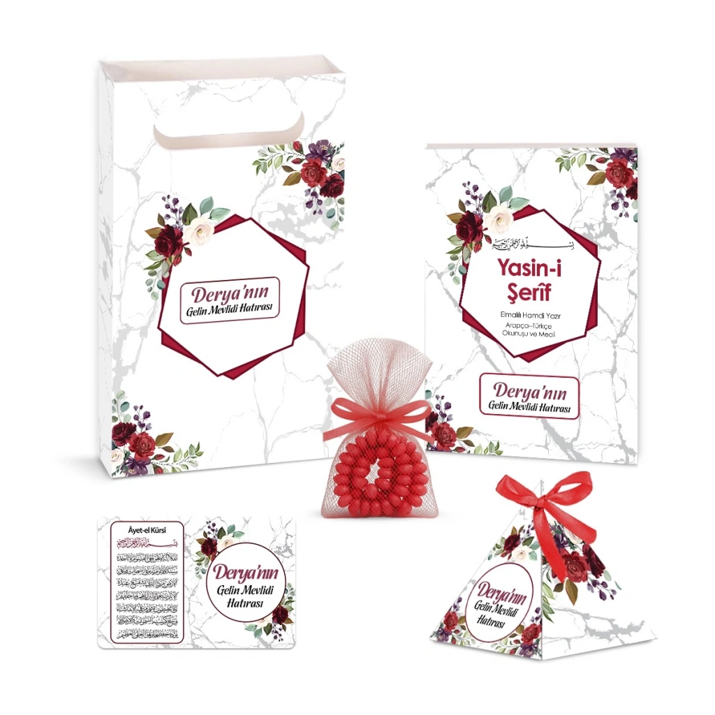 Altıgen Model Kırmızı Renkli Yasin Kitabı, Piramit Külah, Mevlüt Şekeri, Ayet-el Kürsi Magnet, Karton Çanta