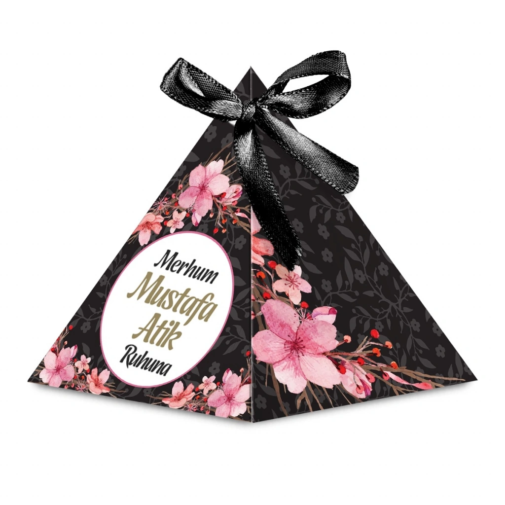 Çiçek Model Siyah Renkli Mevlüt Şekeri İçin İsme Özel Piramit Külah