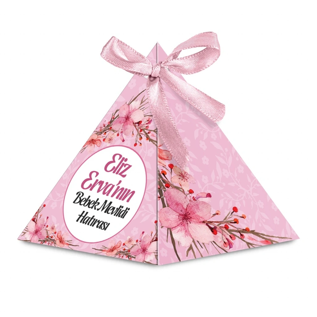 Çiçek Model Pembe Renkli Mevlüt Şekeri İçin İsme Özel Piramit Külah