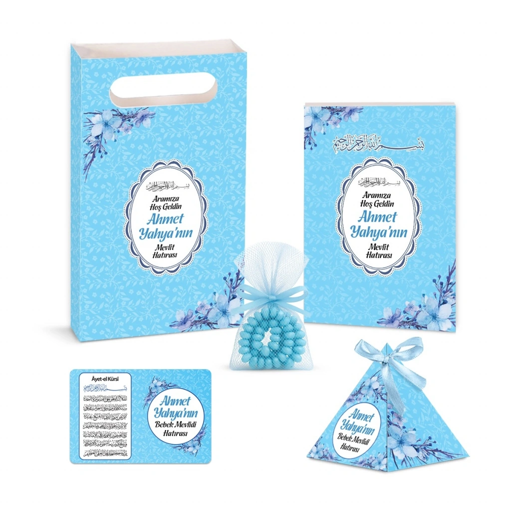Çiçek Model Mavi Renkli Yasin Kitabı, Piramit Külah, İsme Özel Magnet, Karton Çanta ve Tesbih Seti