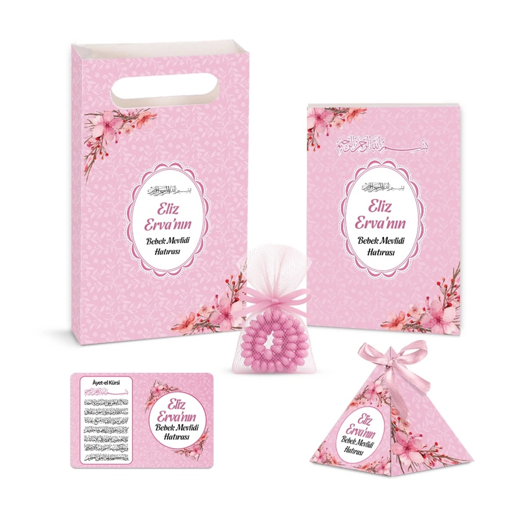 Çiçek Model Pembe Renkli Yasin Kitabı, Piramit Külah, İsme Özel Magnet, Karton Çanta ve Tesbih Seti