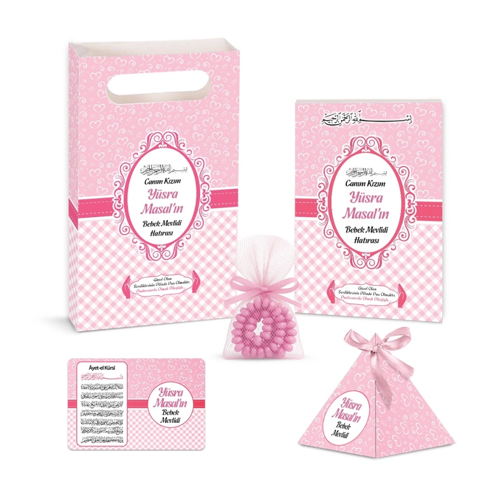 Kalp Model Pembe Renkli Yasin Kitabı, Piramit Külah, Mevlüt Şekeri, Ayet-el Kürsi Magnet, Karton Çanta