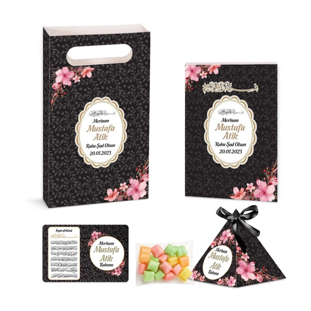 Çiçek Model Siyah Renkli Yasin Kitabı, Piramit Külah, Mevlüt Şekeri, Ayet-el Kürsi Magnet, Karton Çanta