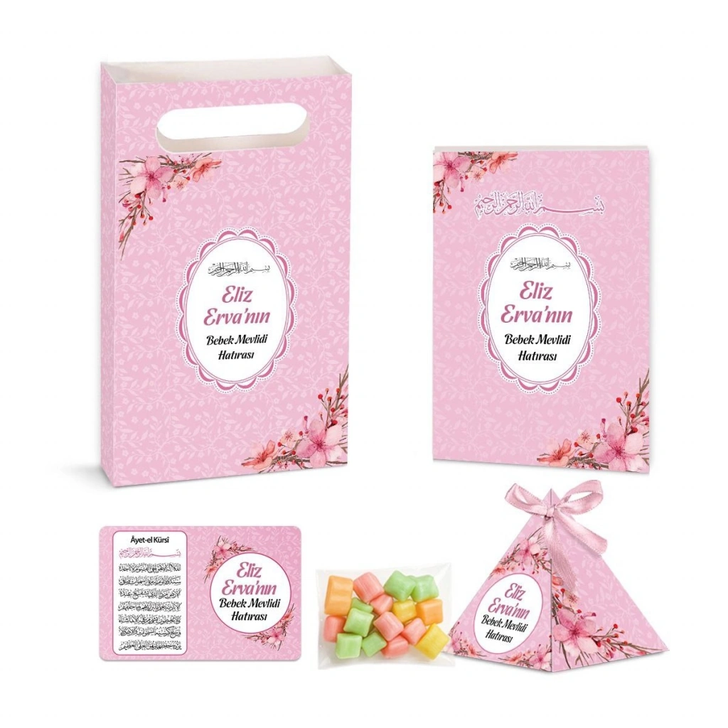 Çiçek Model Pembe Renkli Yasin Kitabı, Piramit Külah, Mevlüt Şekeri, Ayet-el Kürsi Magnet, Karton Çanta