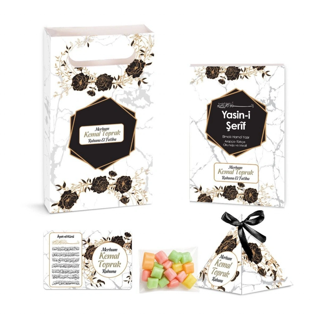 Yasin Kitabı, İsme Özel Piramit Külah, İsme Özel Ayet-el Kürsi Magnet, Karton Çanta ve Mevlüt Şekeri Seti