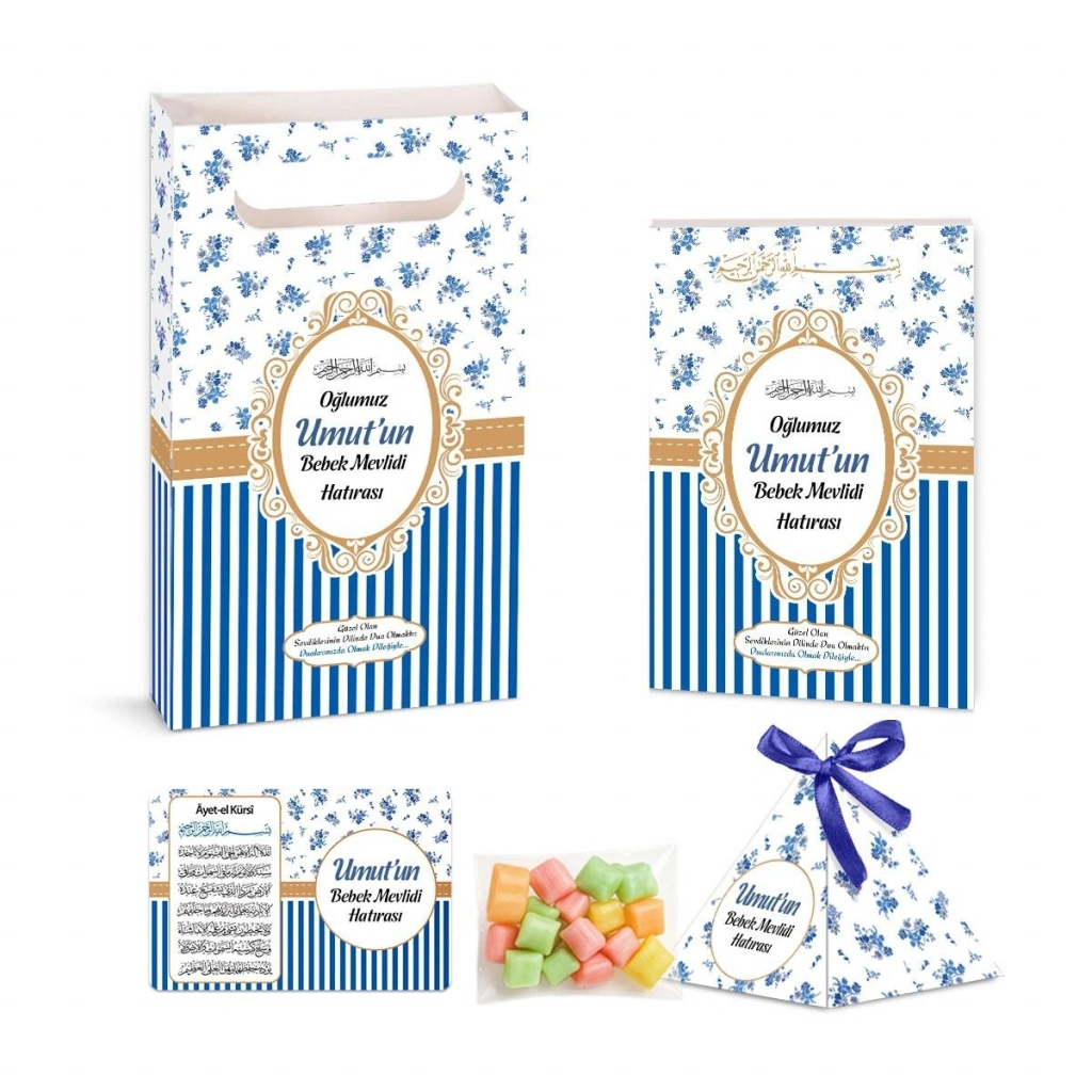 Çizgi Model Lacivert Renkli Yasin Kitabı, Piramit Külah, Mevlüt Şekeri, Ayet-el Kürsi Magnet, Karton Çanta