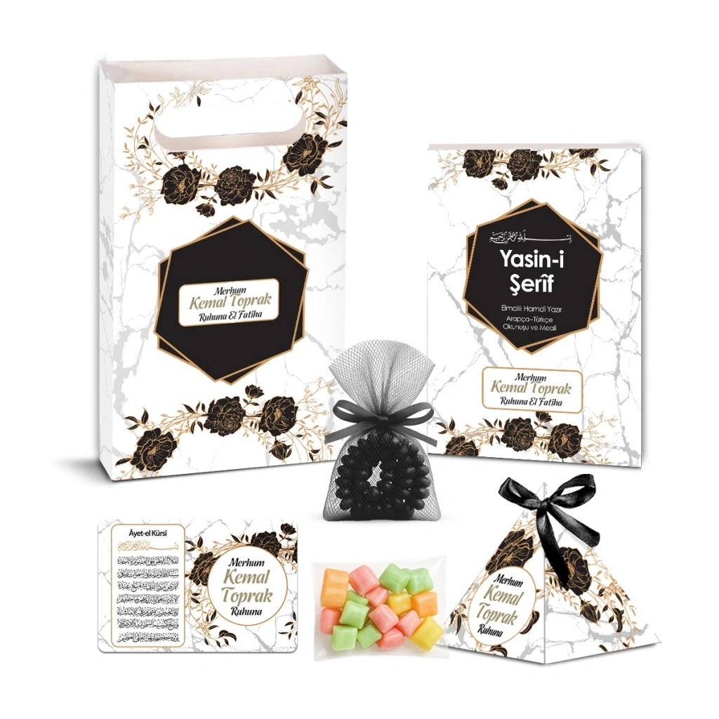 Altıgen Model Siyah Renkli Yasin Kitabı, İsme Özel Piramit Külah, İsme Özel Ayet-el Kürsi Magnet, Karton Çanta, Tesbih ve Mevlüt Şekeri Seti