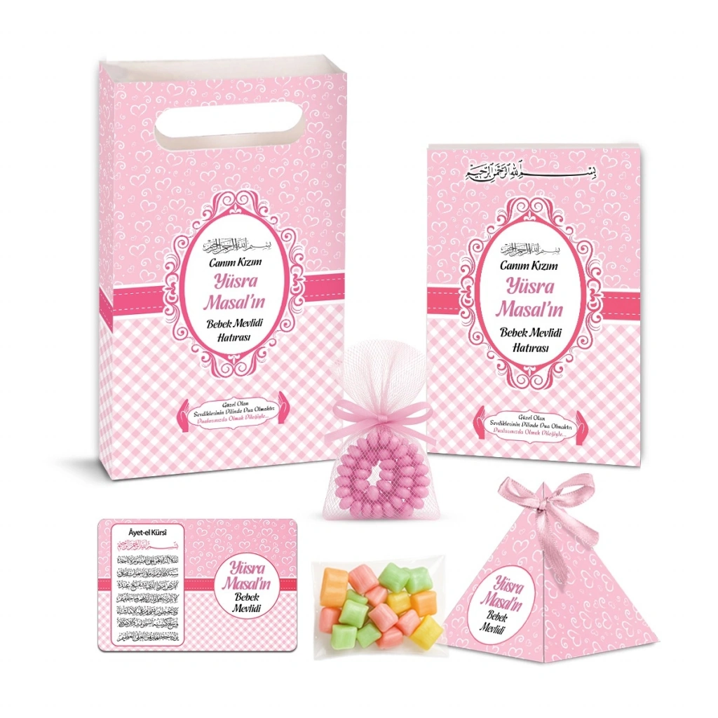 Kalp Model Pembe Renkli Yasin Kitabı, İsme Özel Piramit Külah, İsme Özel Ayet-el Kürsi Magnet, Karton Çanta, Tesbih ve Mevlüt Şekeri Seti