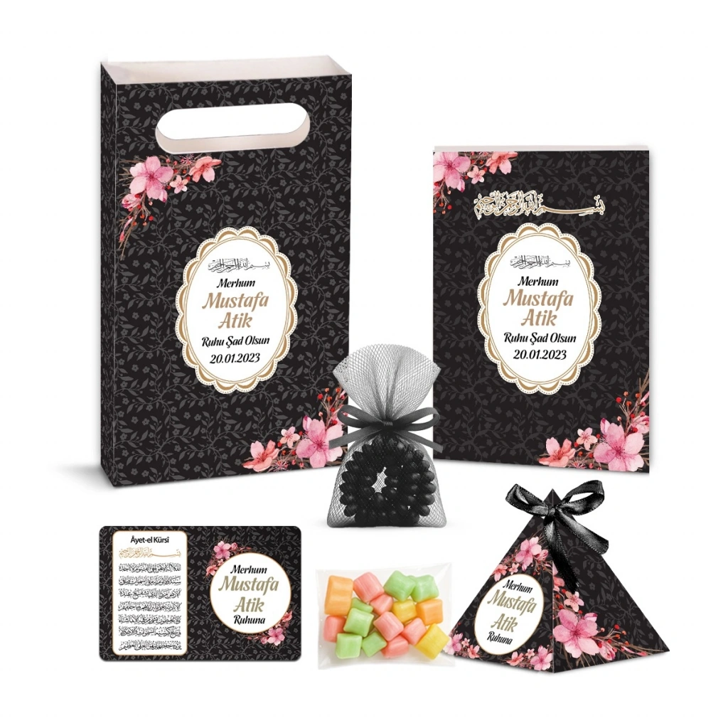 Çiçek Model Siyah Renkli Yasin Kitabı, İsme Özel Piramit Külah, İsme Özel Ayet-el Kürsi Magnet, Karton Çanta, Tesbih ve Mevlüt Şekeri Seti