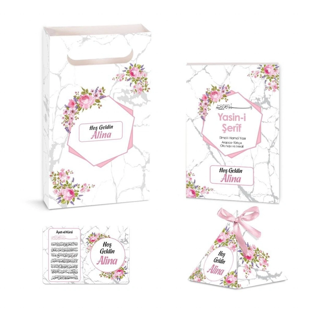 Altıgen Model Pembe Renkli Yasin Kitabı, Piramit Külah, İsme Özel Magnet, Karton Çanta Seti