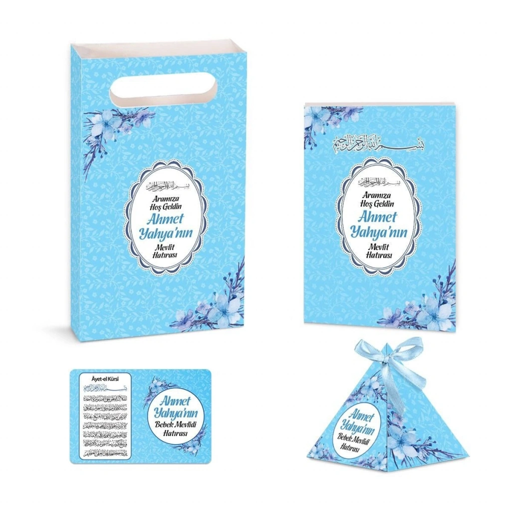 Çiçek Model Mavi Renkli Yasin Kitabı, Piramit Külah, İsme Özel Magnet, Karton Çanta Seti