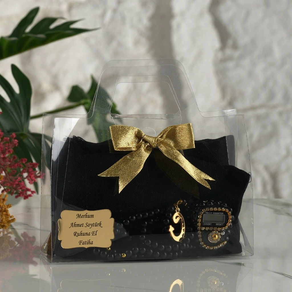 Asetat Çanta İçerisinde İsme Özel Siyah Renkli Eşarp, Tesbih ve Zikirmatik Seti
