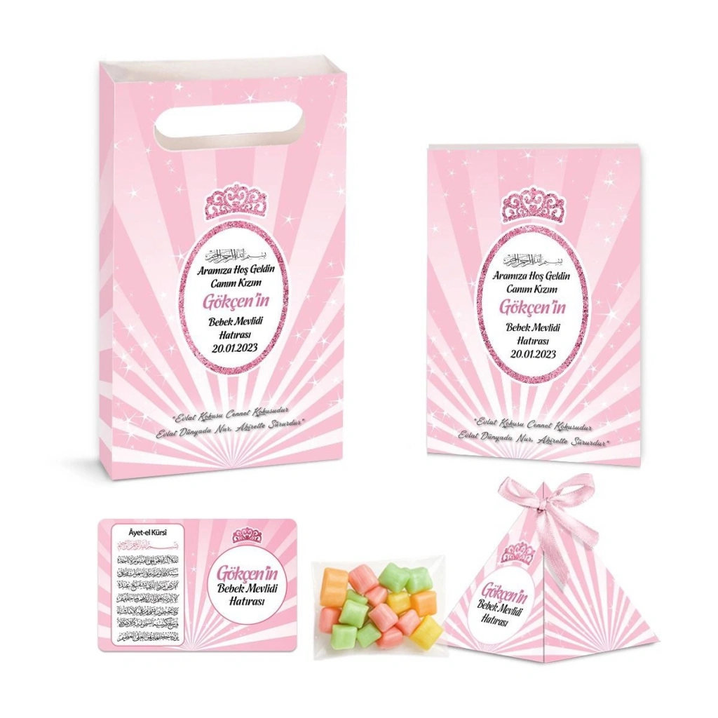 Taç Model Pembe Renkli Yasin Kitabı, Piramit Külah, Mevlüt Şekeri, Ayet-el Kürsi Magnet, Karton Çanta