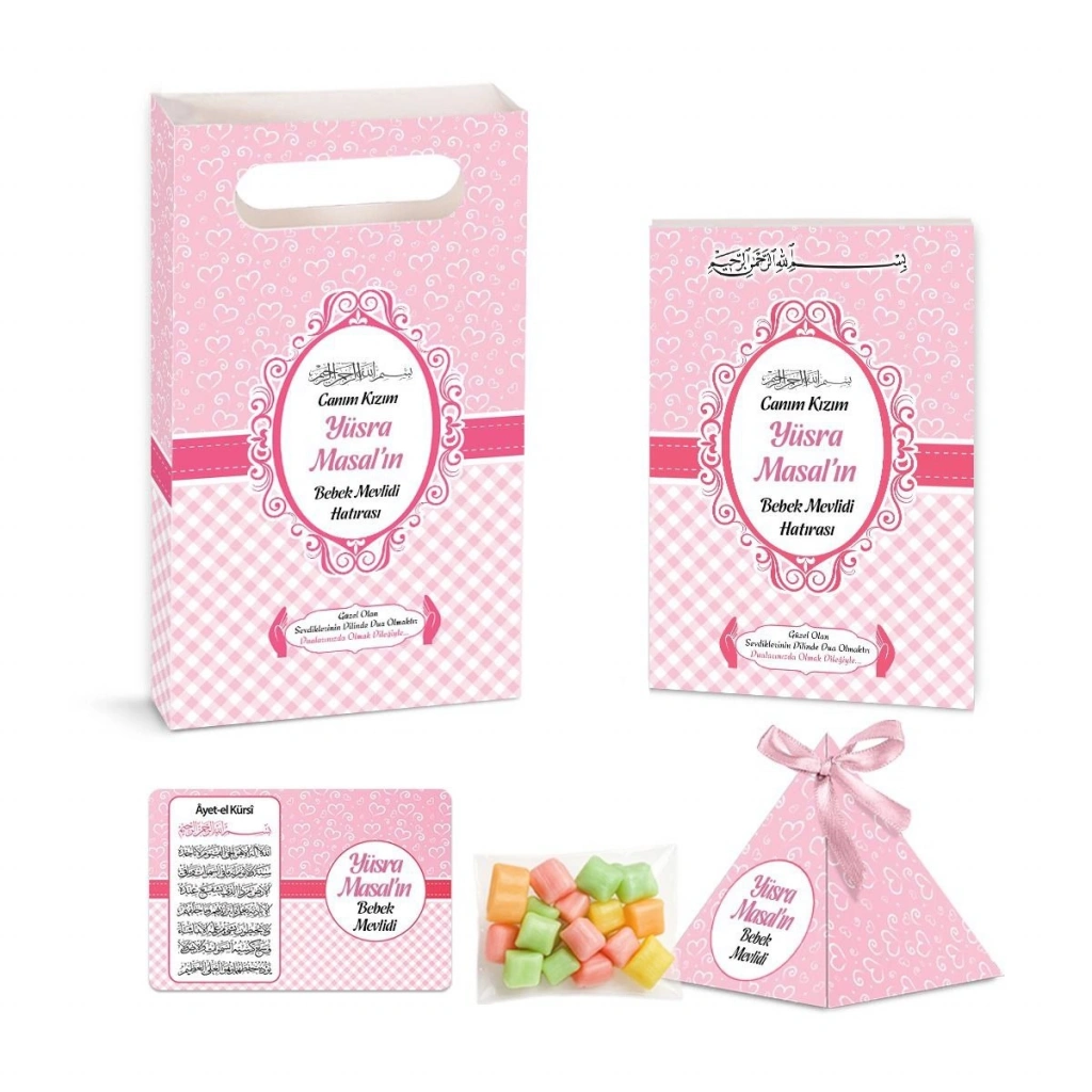Yasin Kitabı, İsme Özel Piramit Külah, İsme Özel Ayet-el Kürsi Magnet, Karton Çanta ve Mevlüt Şekeri Seti