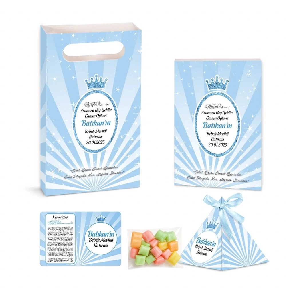Taç Model Mavi Renkli Yasin Kitabı, Piramit Külah, Mevlüt Şekeri, Ayet-el Kürsi Magnet, Karton Çanta