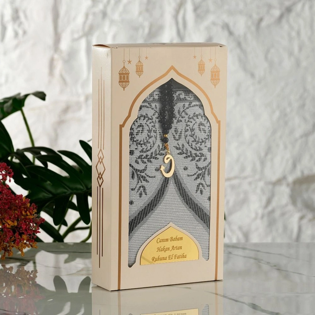 • İsme Özel Dikey Kutu İçerisinde Siyah Renkli Seccade ve Tesbih