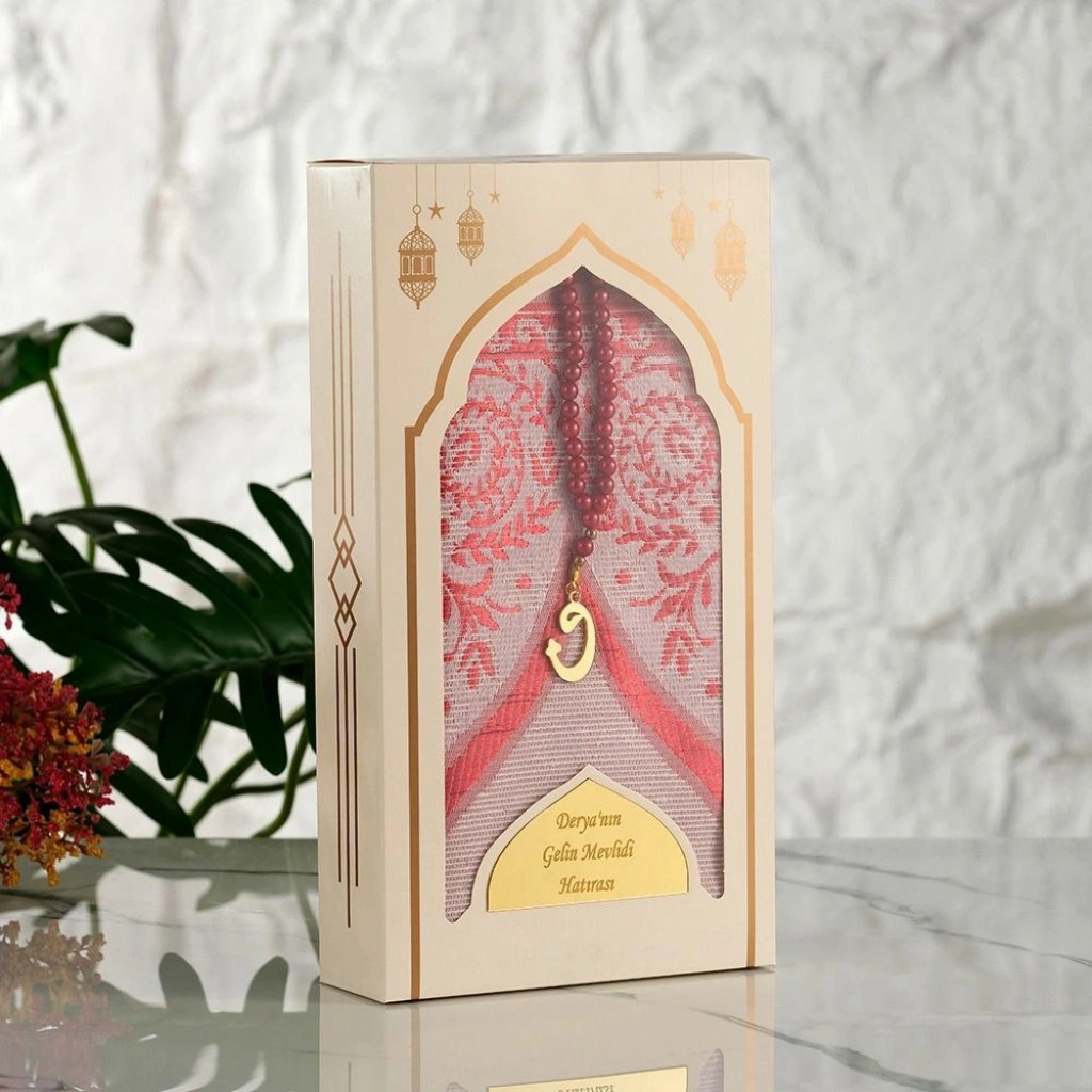 • İsme Özel Dikey Kutu İçerisinde Bordo Renkli Seccade ve Tesbih