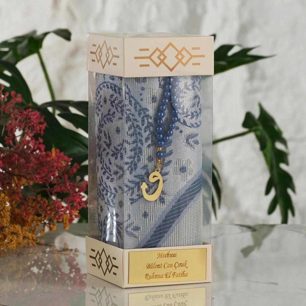 • İsme Özel Silindir Kutu İçerisinde Saks Mavisi Renkli Seccade ve Tesbih