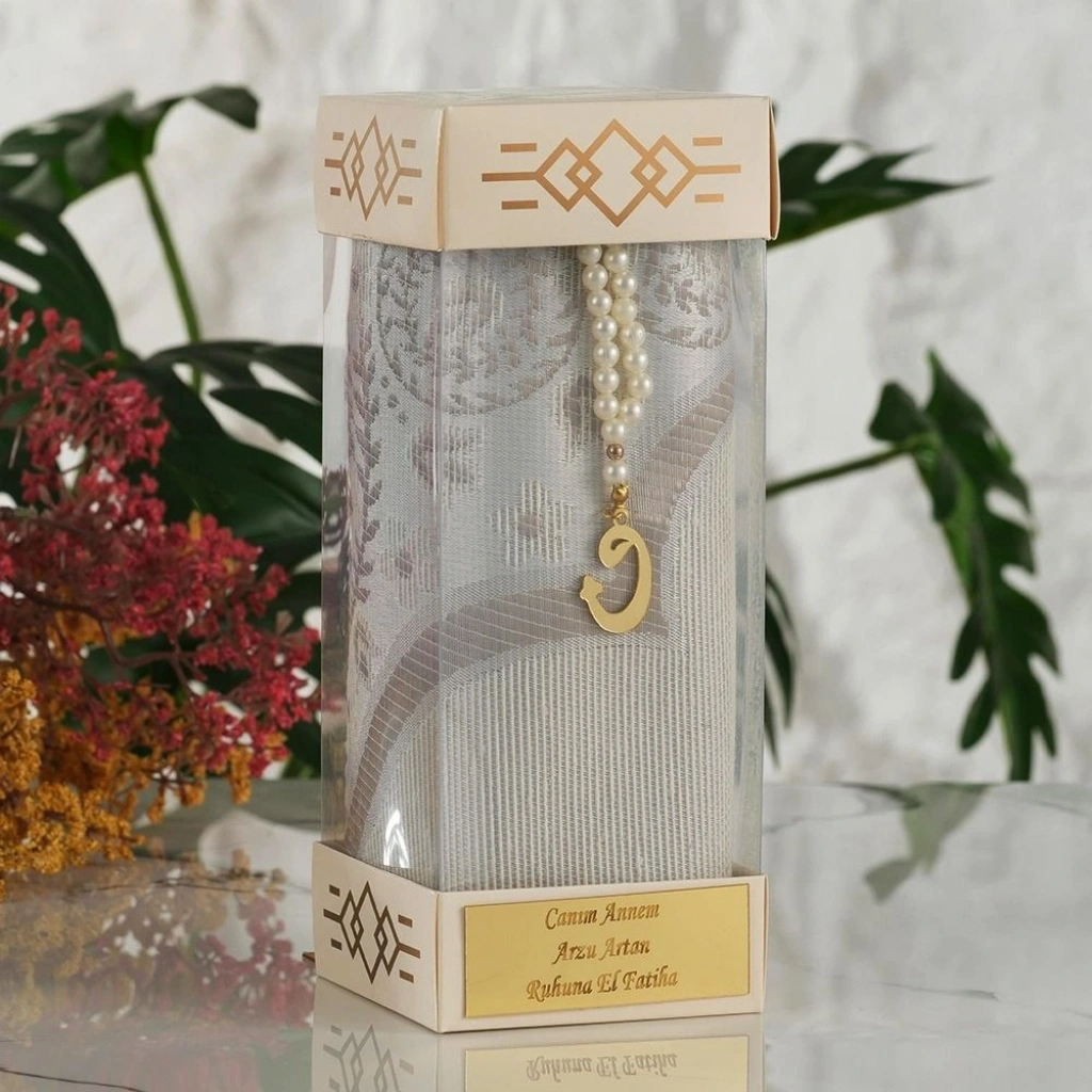 • İsme Özel Silindir Kutu İçerisinde Krem Renkli Seccade ve Tesbih