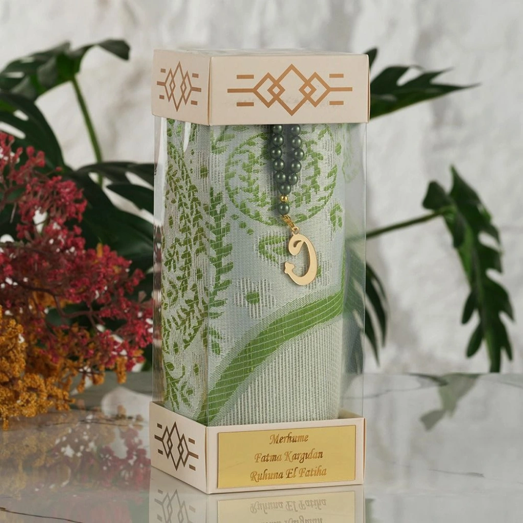 • İsme Özel Silindir Kutu İçerisinde Zümrüt Renkli Seccade ve Tesbih