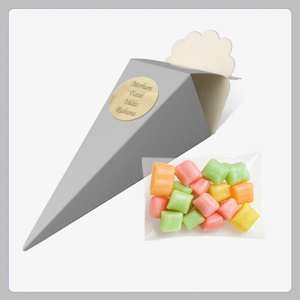 Ürünleriniz, kargo sürecinde külah kutuların ezilmemesi ve hijyenik koşulların korunması adına demonte olarak gönderilmektedir. Külah kutu (açık halde),ambalajlı şeker ve isme özel pleksi ayrı ayrı paketlenir. Külahı katlamak, şekeri içine koymak ve pleksiyi yapıştırmak oldukça kolay ve pratiktir.