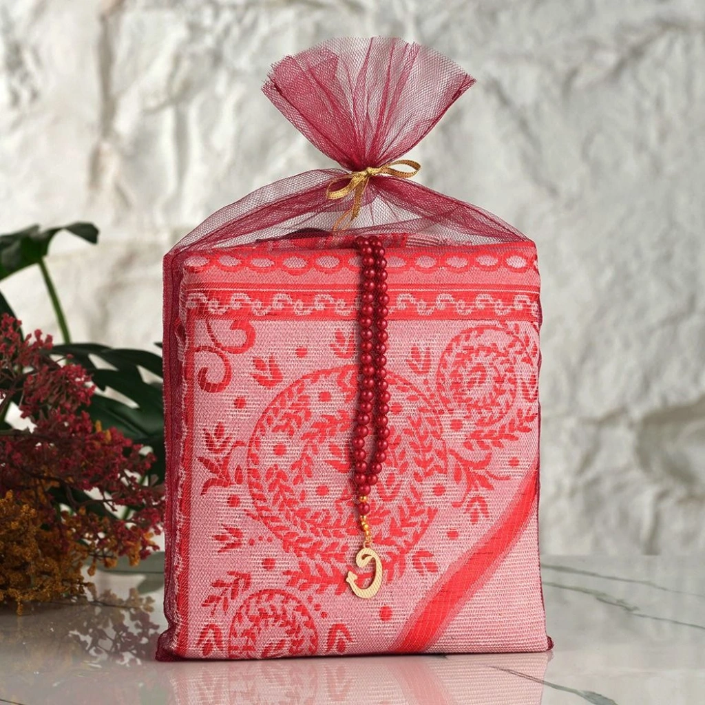 Tül Kese İçerisinde Bordo Renkli Seccade ve Tesbih