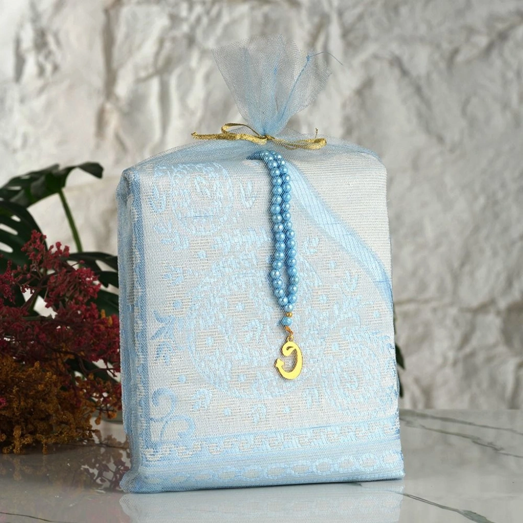 Tül Kese İçerisinde Mavi Renkli Seccade ve Tesbih