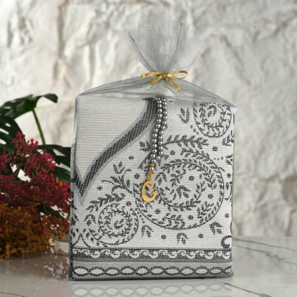 Tül Kese İçerisinde Gri Renkli Seccade ve Tesbih