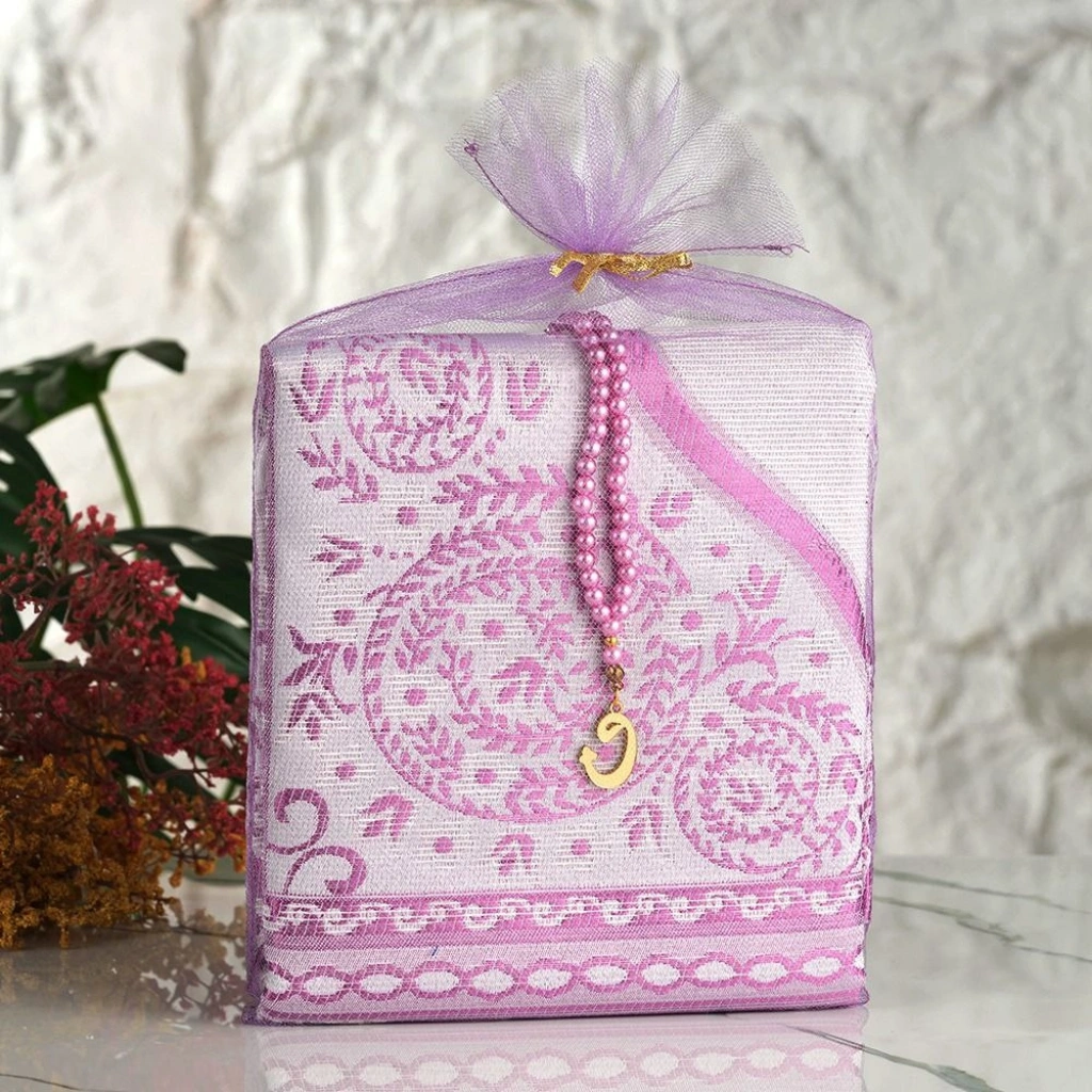 Tül Kese İçerisinde Lila Renkli Seccade ve Tesbih